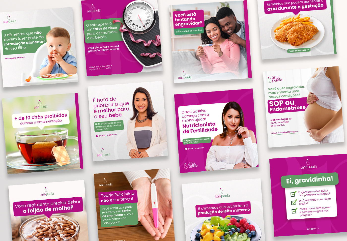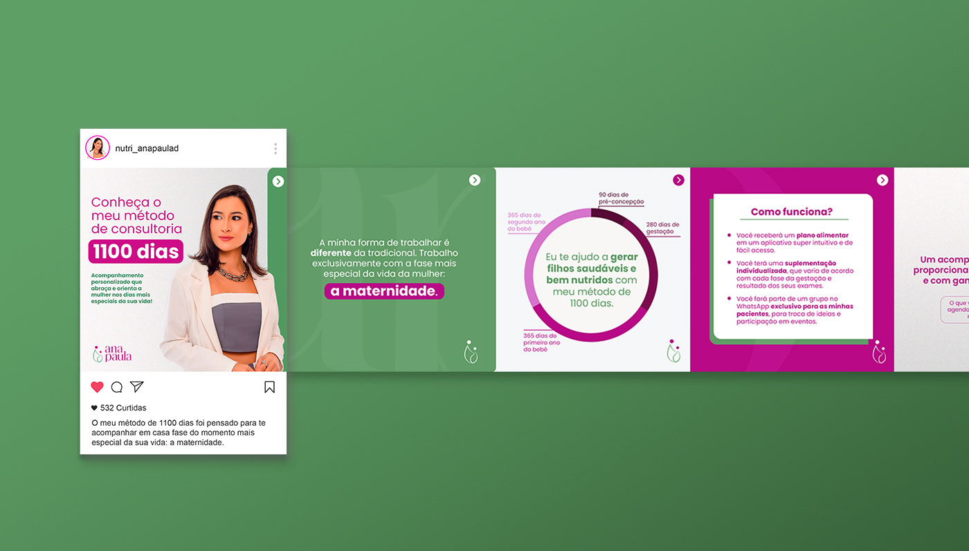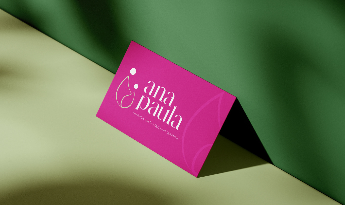 Ana Paula Damasceno é nutricionista materno-infantil, sua missão é cuidar da saúde nutricional de pessoas que estão tentando engravidar, das gestantes, lactantes e de seus filhos, durante toda a infância. Assim a identidade visual carrega conceitos de saúde e cuidado expressos nas curvas e formas delicadas da tipografia e do símbolo.