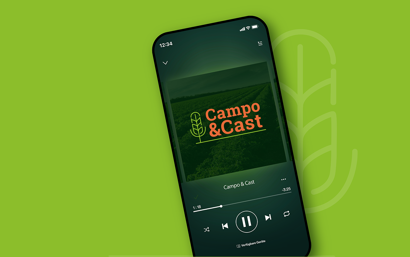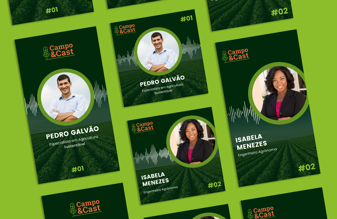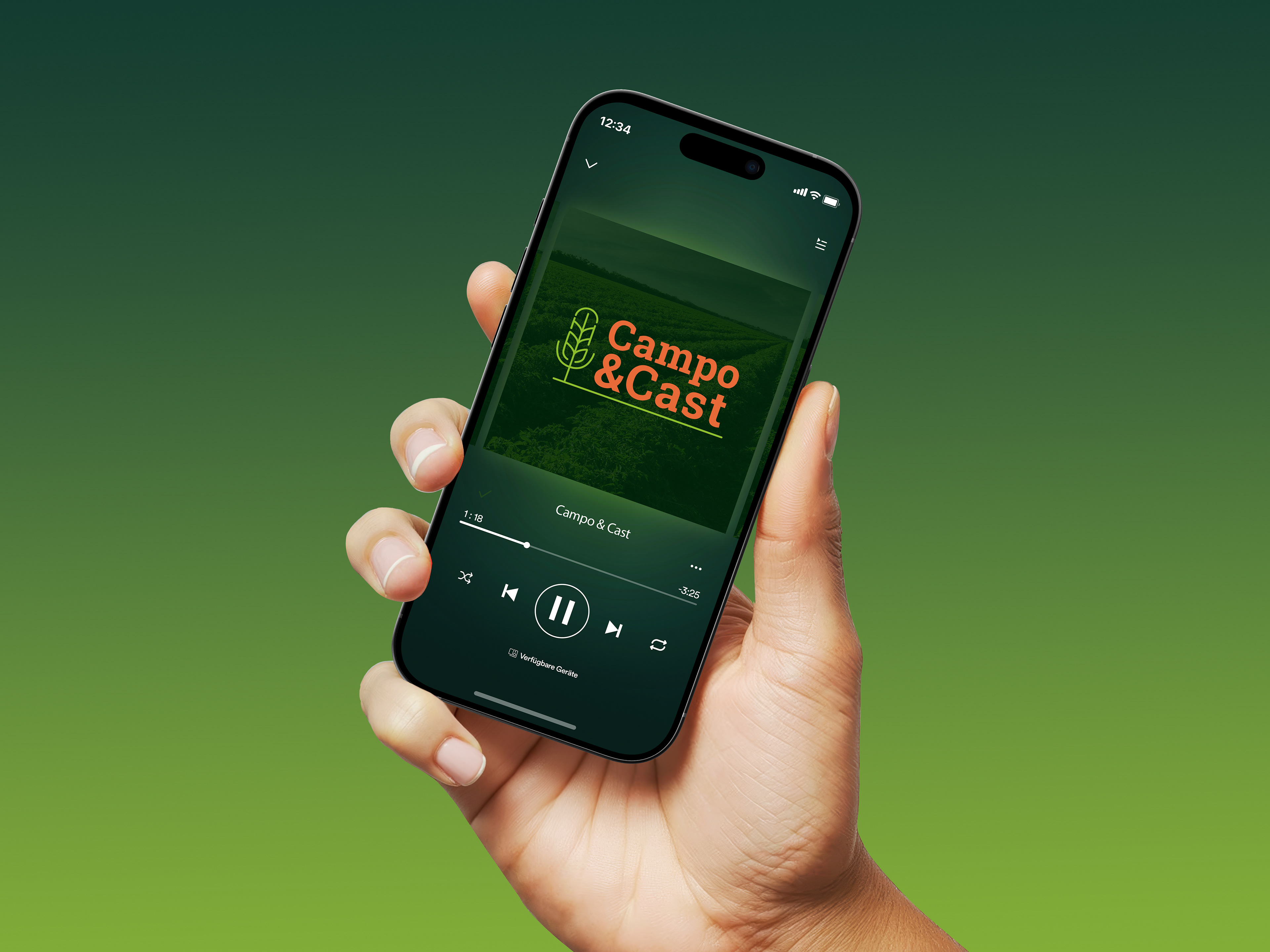 Campo & Cast é um podcast sobre o setor agropecuário que pertence à Revista Campo & Negócios. O logotipo do podcast busca manter semelhanças com o logo da revista através da tipografia e paleta de cores e traz um novo elemento, este que combina o microfone e o trigo representando a relação entre o podcast e os assuntos relacionado ao campo.