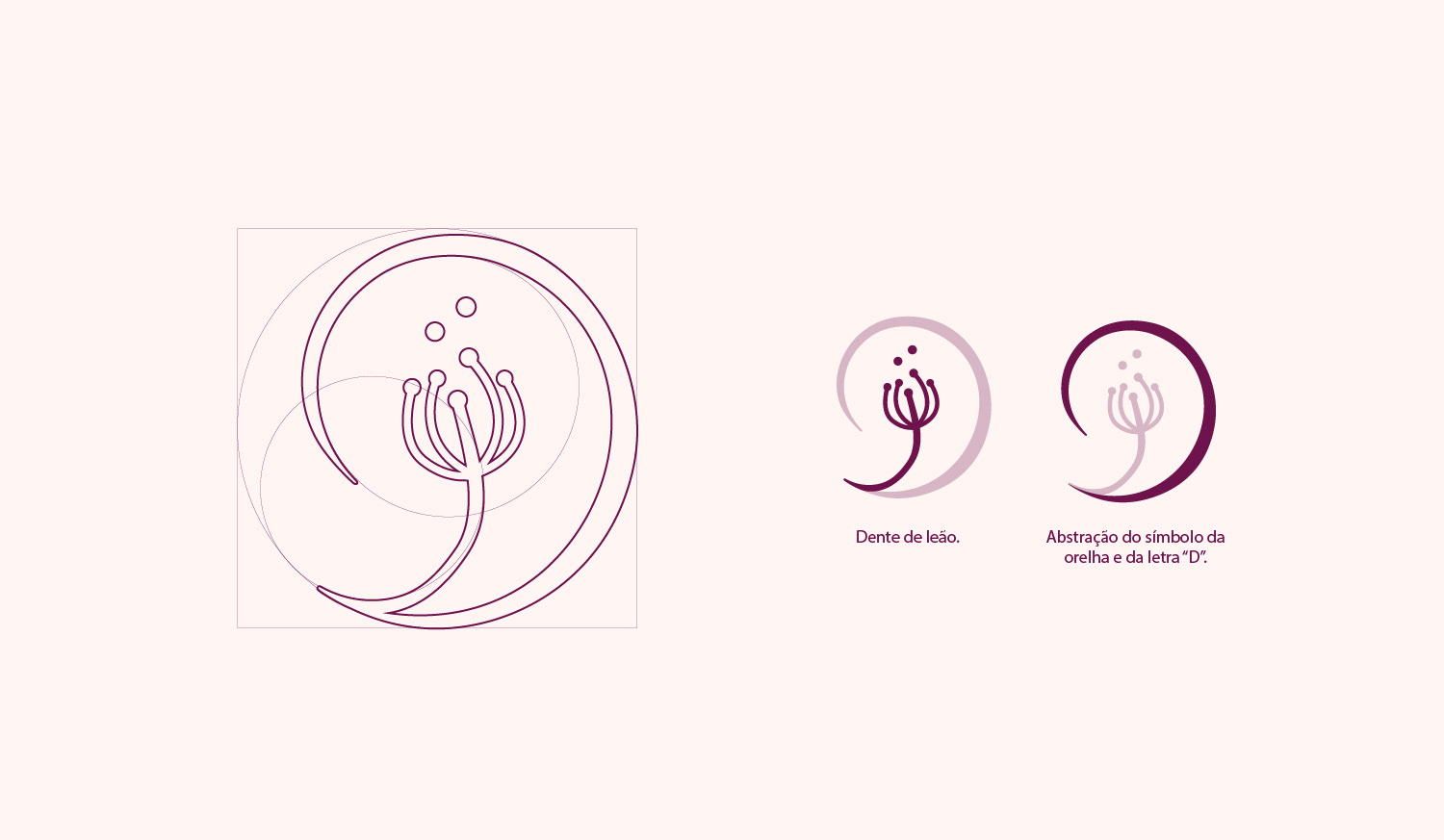 O logotipo reúne a essência da marca: acolher, escutar e acompanhar processos de transformação. O dente de leão foi escolhido como símbolo central por evocar inocência, delicadeza e desenvolvimento. Uma linha em espiral envolve o dente de leão, simbolizando o acolhimento, a escuta e a elaboração psíquica. Essa linha também sugere a curva de uma orelha, em referência à escuta atenta, e a letra “D” conectando o símbolo ao nome da marca.