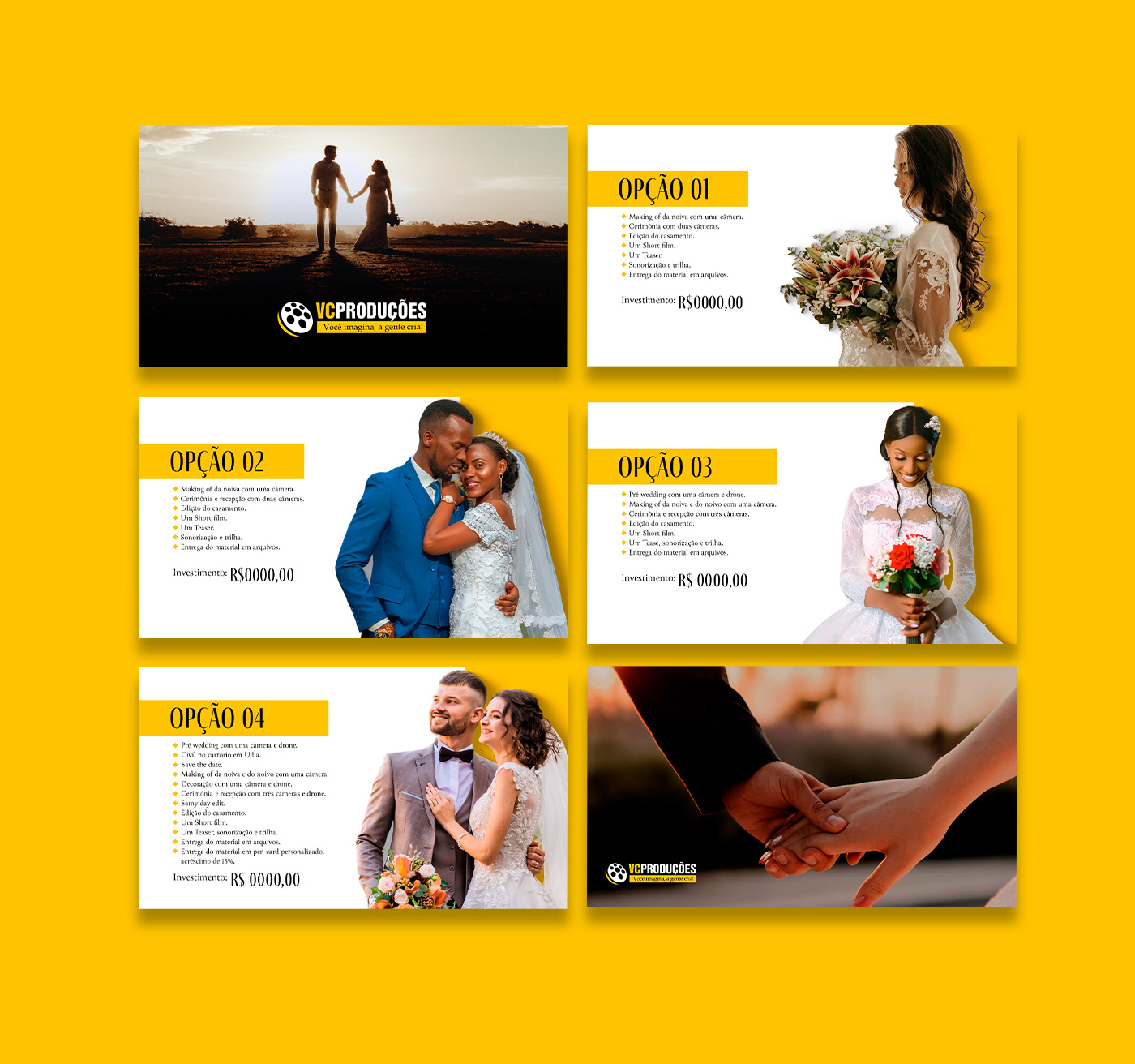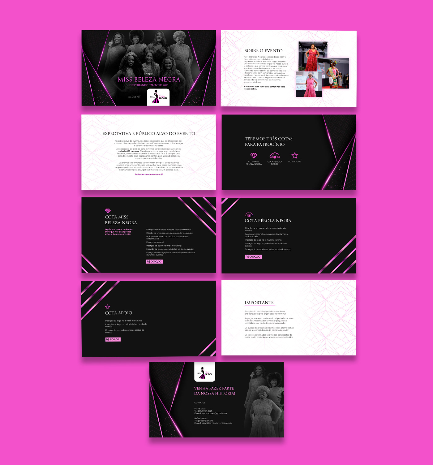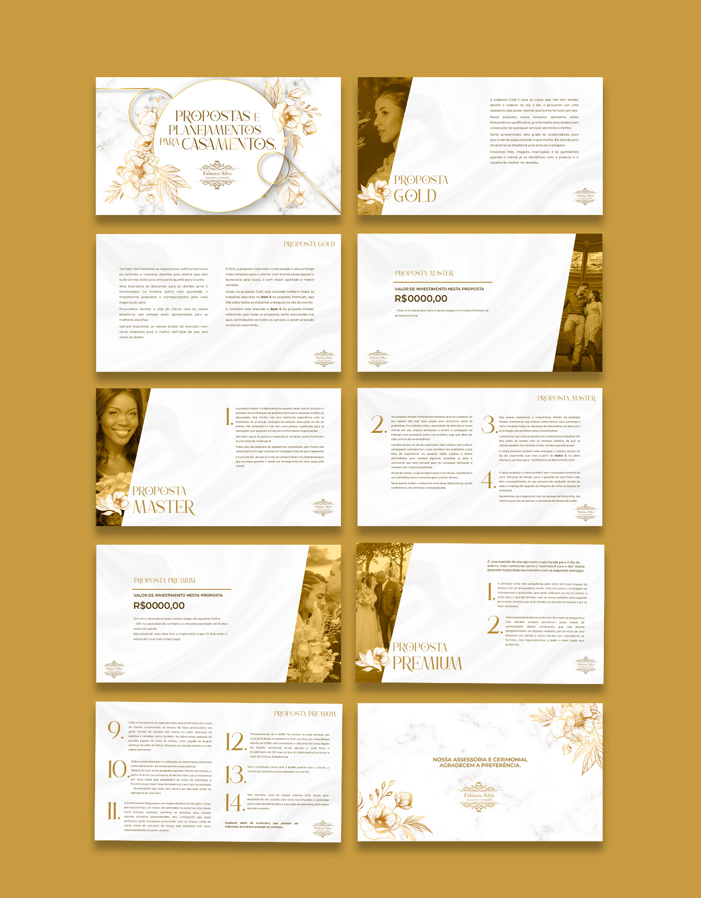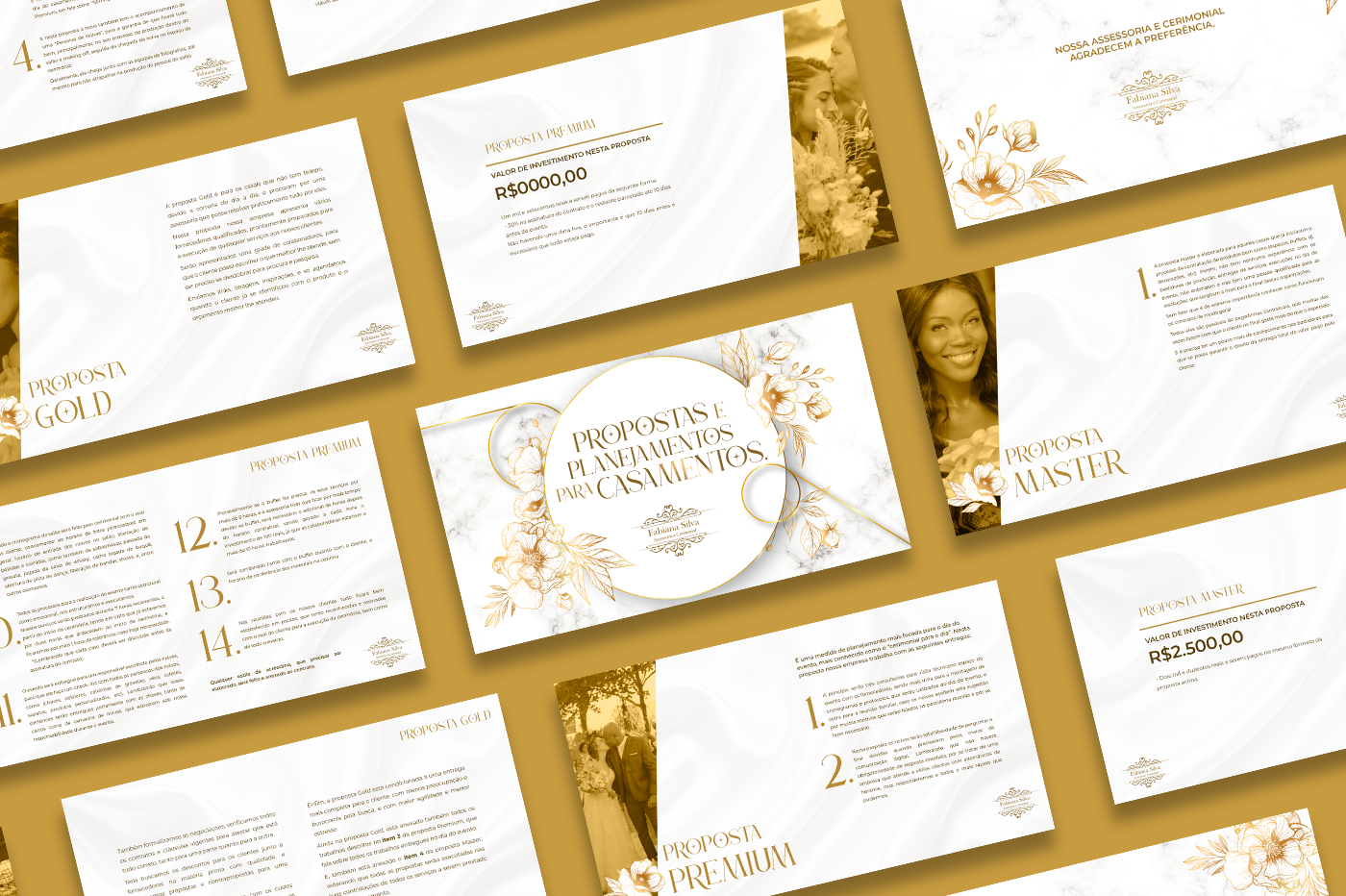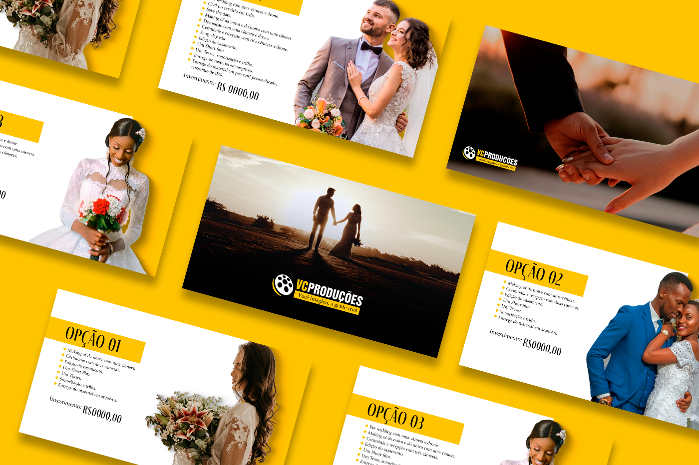 Design de apresentações de proposta comercial, mídia kit e portifólio desenvolvidos para profissionais e empresas que atuam nos segmentos de cerimonial para casamentos, produções audiovisuais, educação e promoção de concursos de beleza.